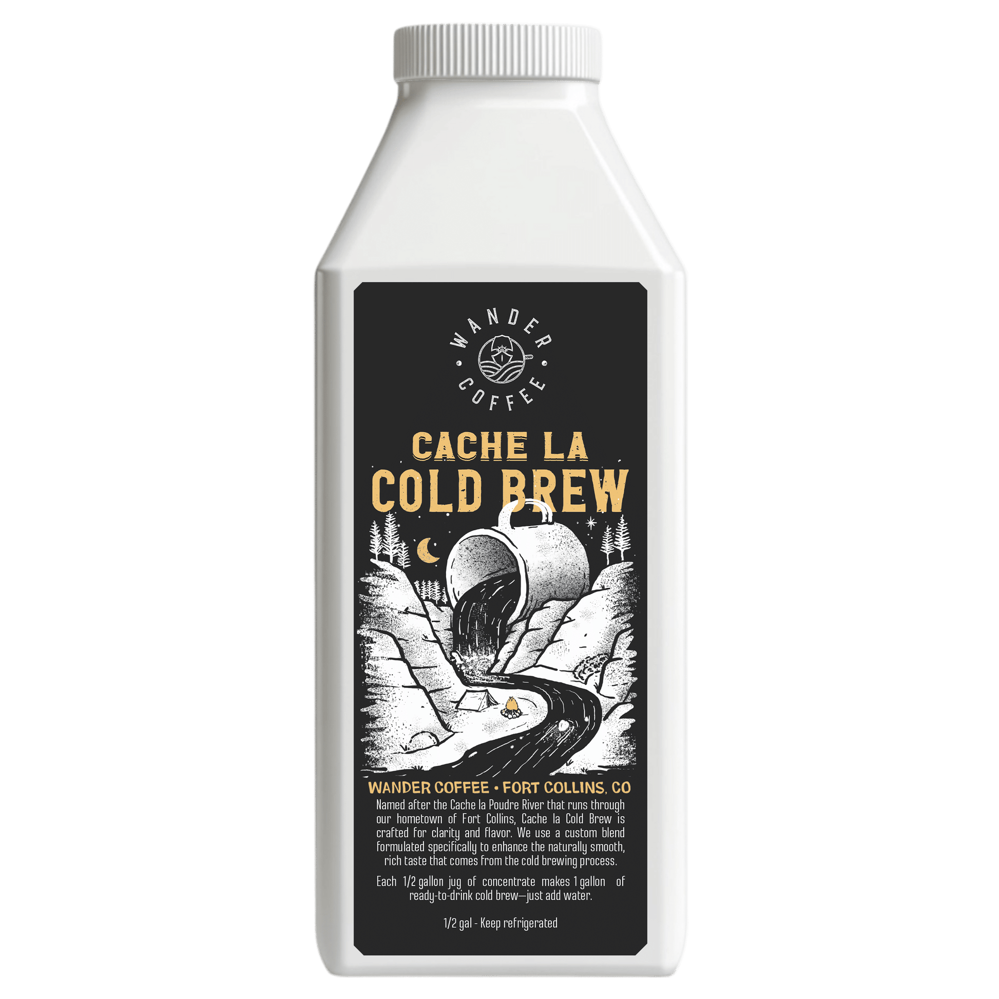 Named after the Cache la Poudre River that runs through our hometown of Fort Collins, Cache la Cold Brew is crafted for clarity and flavor. We use a custom blend formulated specifically to enhance the naturally smooth, rich taste that comes from the cold brewing process.