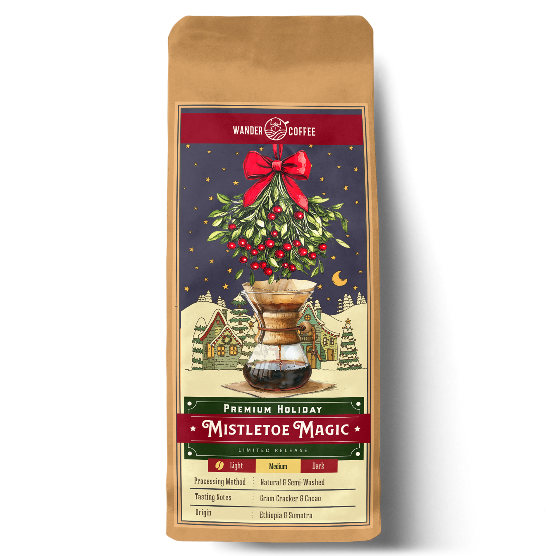 Wander Coffee’s Mistletoe Magic brings a festive twist to your holiday brew with a harmonious blend of medium roast Sumatra and Ethiopia beans, handpicked and carefully processed using natural and semi-washed methods. This seasonal offering evokes the warmth and joy of the season, with delightful notes of graham cracker and cacao that invite cozy moments by the fire. The rich, earthy depth of the Sumatra combines beautifully with the bright, floral nuances of Ethiopia, creating a cup that’s both comforting and uplifting—perfect for sipping during winter celebrations. Inspired by the magic of the holidays, Mistletoe Magic brings together the spirit of tradition and the excitement of the season, offering a flavorful experience that’s as enchanting as a holiday snowfall. Share it with loved ones or enjoy it in peaceful solitude; either way, it’s a brew that embodies the warmth and wonder of Christmas cheer.